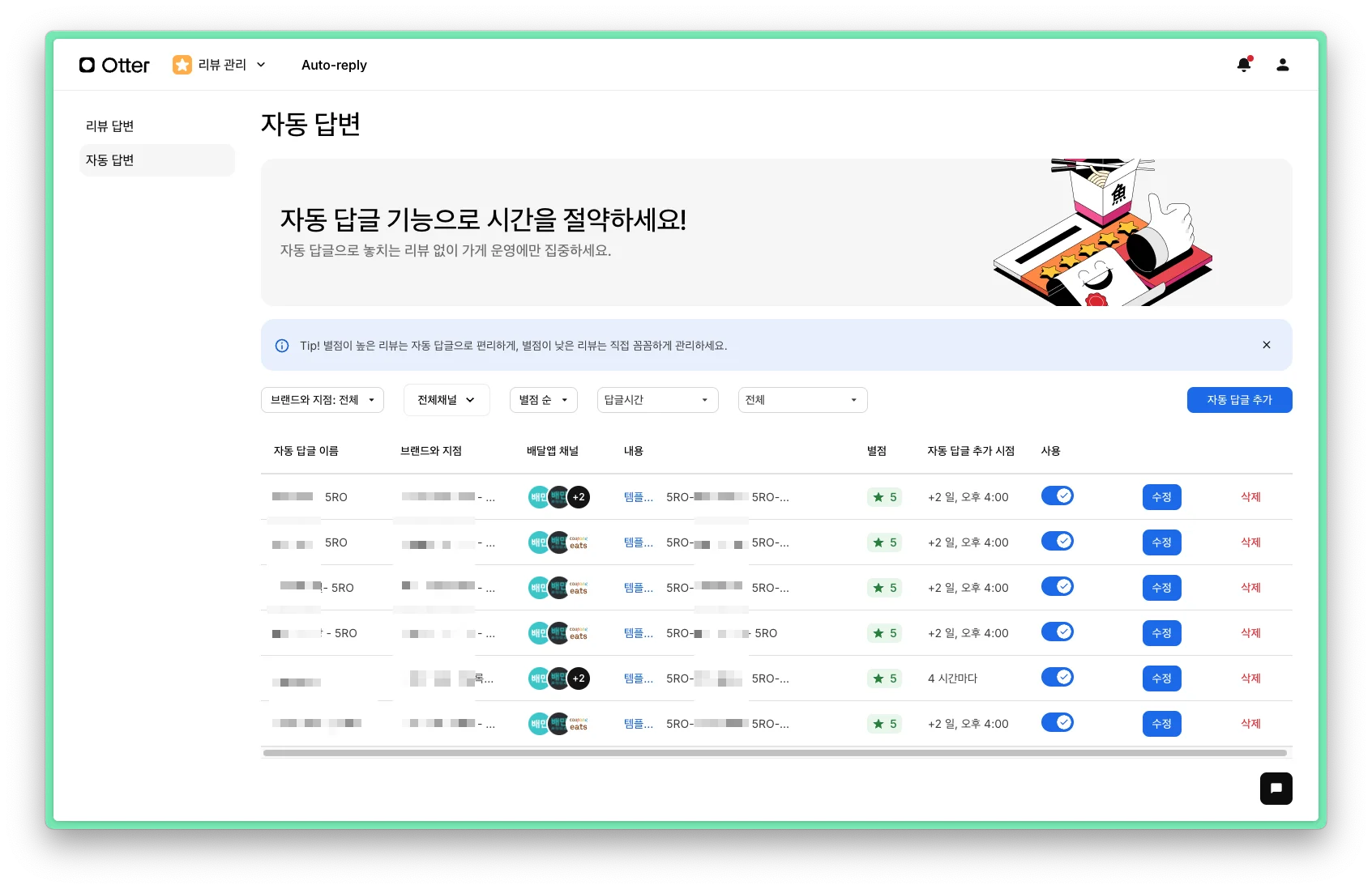 리뷰가 달리면, 오터 가게댓글의 ‘자동리뷰답변’ 기능은요: