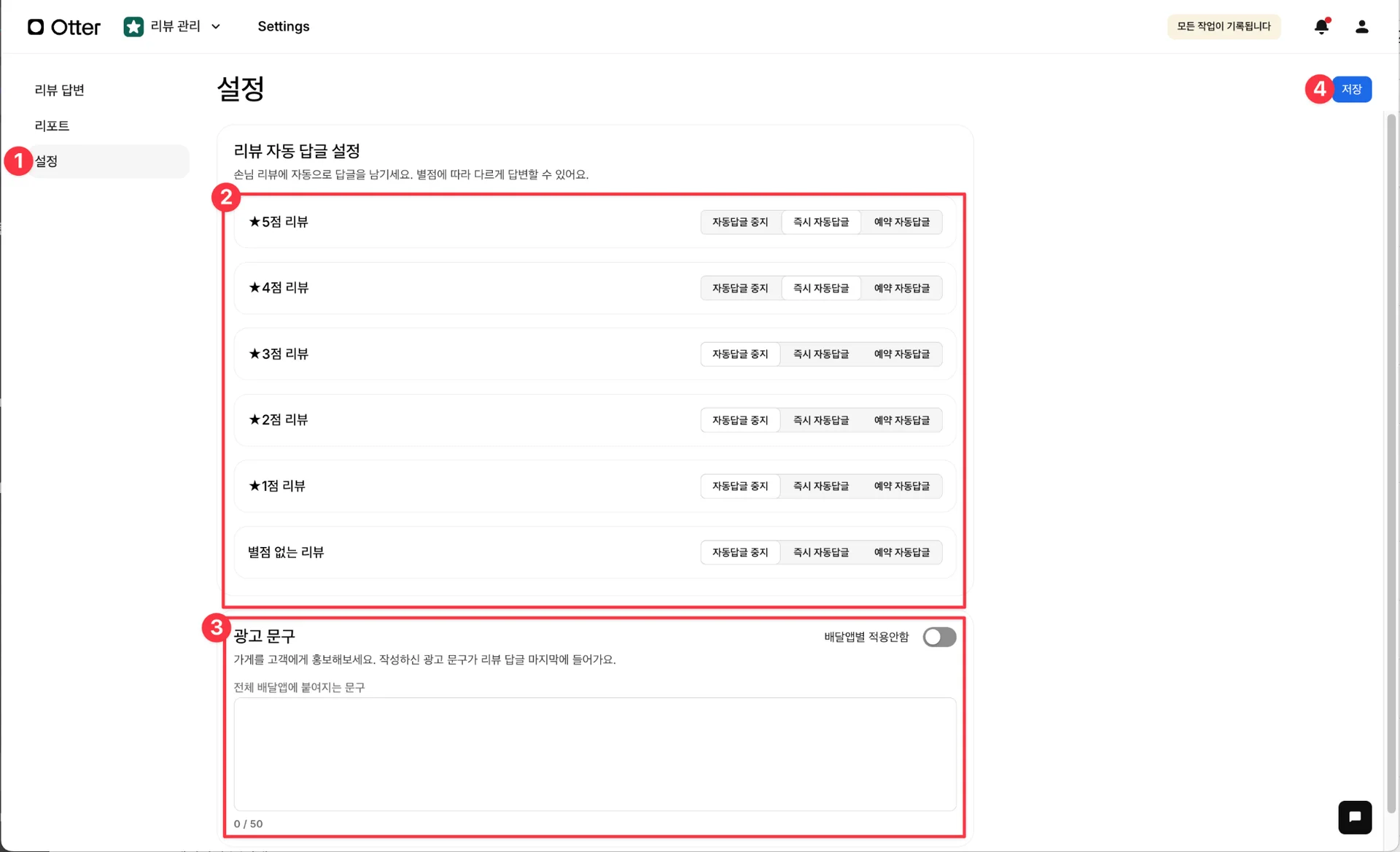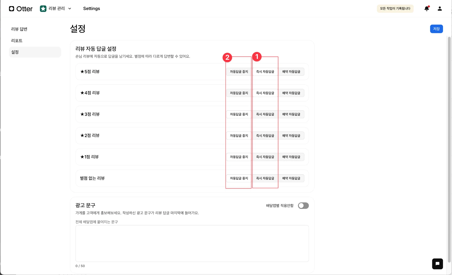 별점별로 자동 답글을 설정하고 싶다면 해당 행의 ‘즉시 자동답글’ 버튼을 모두 눌러 활성화시켜주세요.