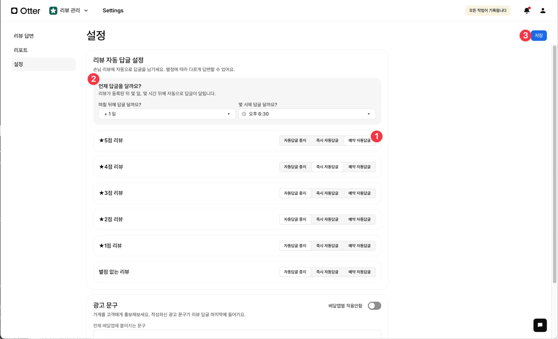 예약 시간 설정을 하게 되면, 모든 별점 리뷰에 대한 답글이 설정한 예약 시간에 자동 등록되게 됩니다.