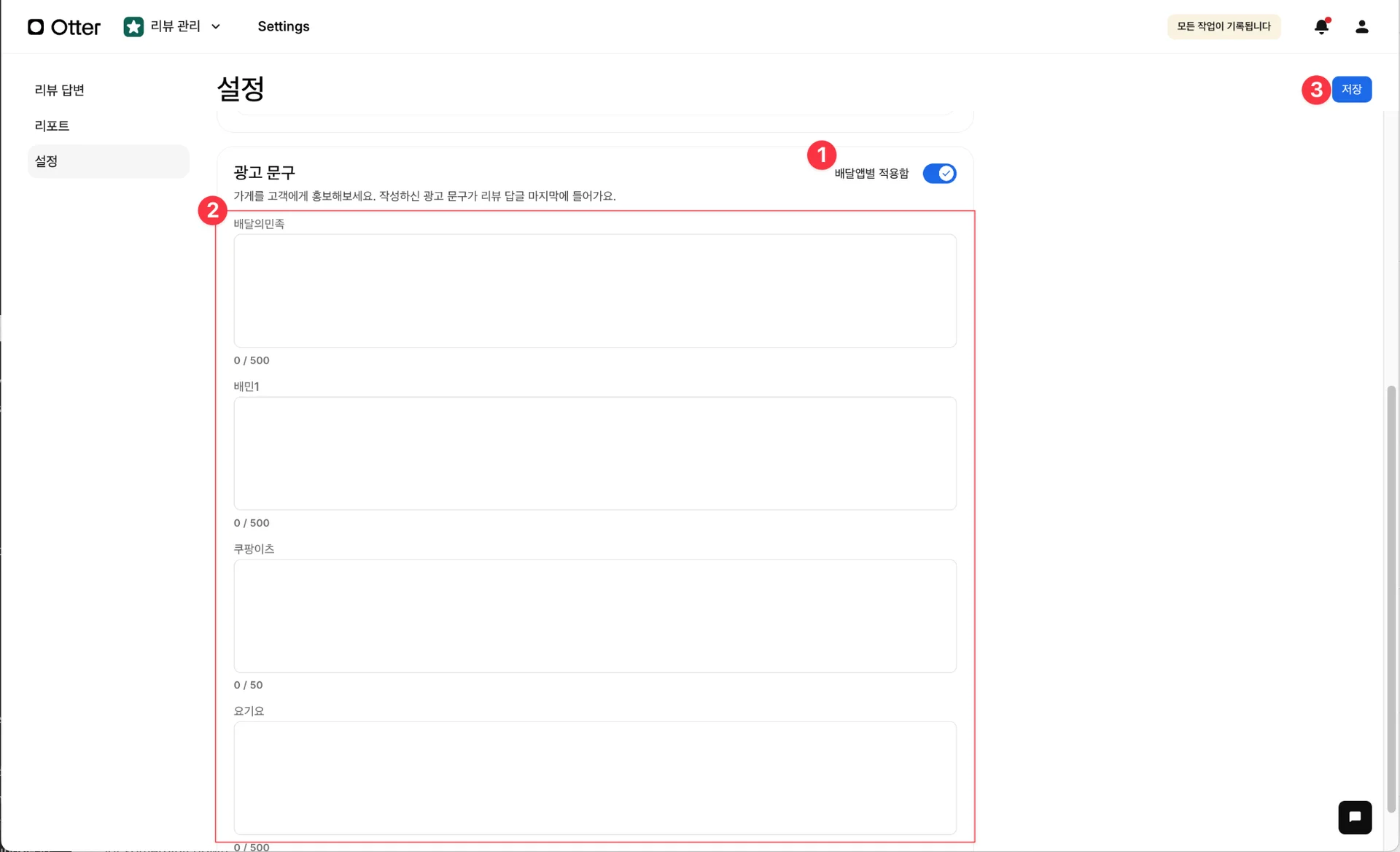 배달앱별로 광고문구를 설정하고 싶으시면 토글 버튼을 활성화시켜주세요.