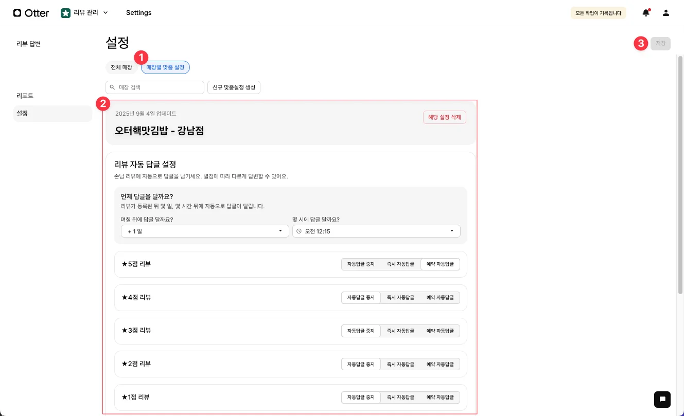 설정하고 싶은 매장 선택 후, 위와 같이 자동 답글 등록/예약 등록 설정을 합니다.